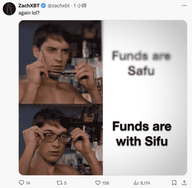 链上侦探 ZachXBT 则以梗图回应:「资金是安全的?不,实际上资金是 Sifu 的。」